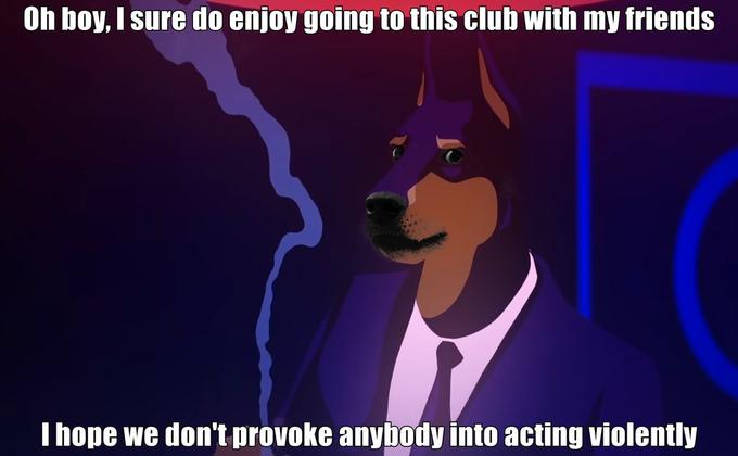 The video shows all the patrons and staff of the club. The most interesting pair on a date in the club would be a fox and swan chuckling to themselves over some drinks. The cats soon get seated beside 3 suited Dobermans. The groups start trading angry and haughty looks, drawing on the age-old cat vs. dog tale.